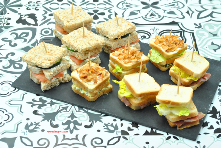 Voici une recette de mini club sandwich ou plutôt des idées d’associations de saveurs. Je rappelle le principe : un club sandwich est composé de 2 étages sinon c’est juste un sandwich ! Il vient des États-Unis et à la base, il est composé de 3 tranches de pain toasté ou grillé, de salade émincée, une tomate tranchée et des tranches de bacon grillé avec une garniture de mayonnaise et de filet de poulet ou de dinde (merci Wikipédia !). Désormais, chacun l’associe et le constitue selon ses goûts et c’est tout aussi bien.