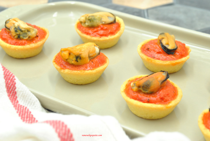 Sur une plaque allant au four recouverte de papier sulfurisé, déposer les mini telline. Les garnir de la crème aux piquillos, déposer une moule dessus et enfourner pour 7 minutes. À déguster chaud, tiède ou même froid.