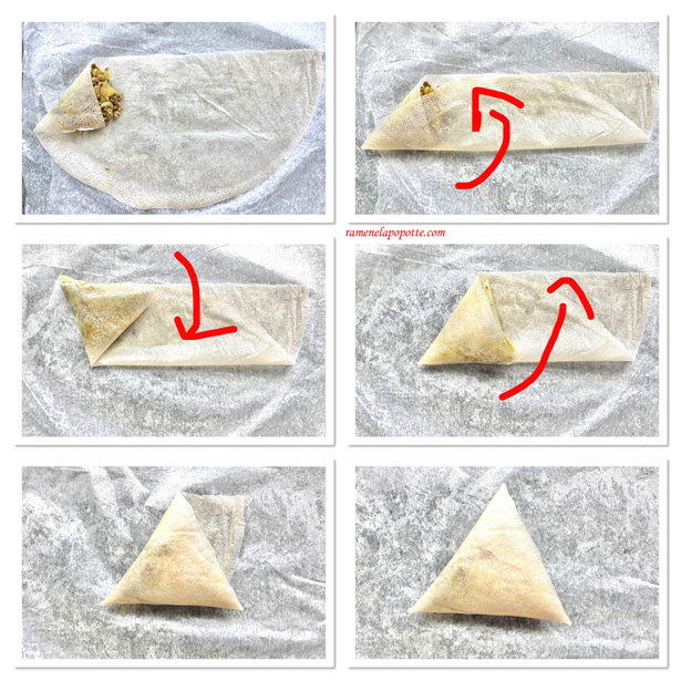Faire fondre le beurre. Couper les feuilles de brick en deux. Prendre une demi feuille de brick et poser le côté arrondi vers le bas. Déposer 1 càs de viande (20 g environ) en haut à gauche. Prendre l’extrémité et la replier pour former un triangle. Remonter le côté arrondi pour emprisonner la farce. Remonter le triangle vers le haut puis vers le bas jusqu’à arriver au bout de la bande et insérer ce qui reste à l’intérieur pour bien fermer le briouate (j’ai mis des photos des différentes étapes).