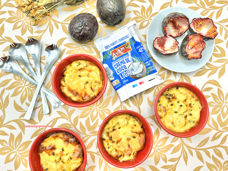 Couper les fruits de la passion en deux et récupérer la pulpe et les graines en les versant dans la préparation puis mélanger.