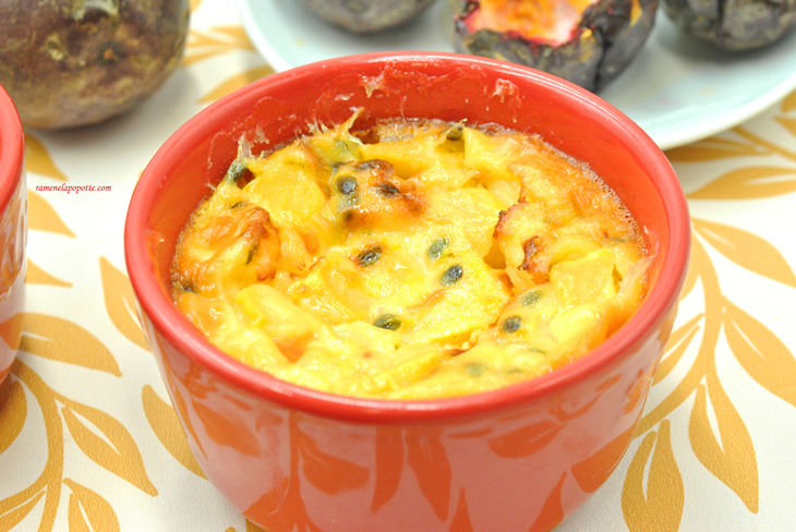 Beurrer les moules. Dans chaque ramequin, répartir les dés de mangue et verser la pâte dessus aux deux tiers.