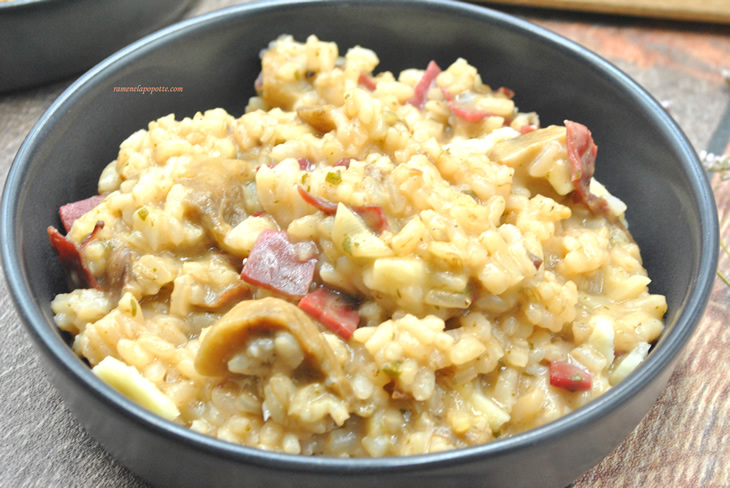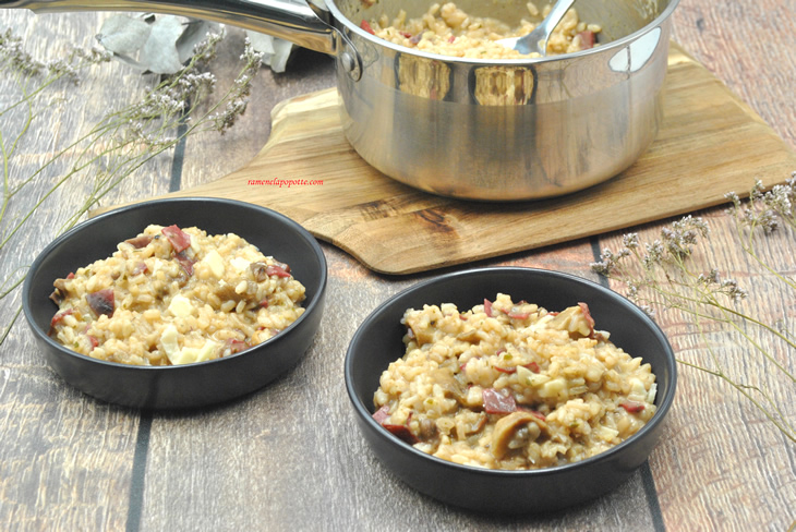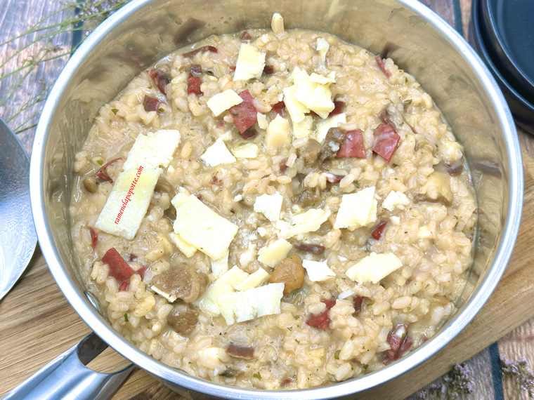 Au bout de 15 minutes de cuisson, saler, poivrer, ajouter la poêlée aux cèpes et beurre persillé, la viande de grison, le fromage en mélangeant entre chaque ajout et une dernière louche de bouillon. Prolonger la cuisson de 5 minutes.