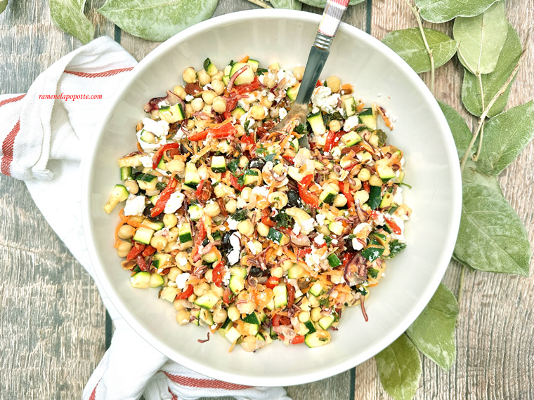 Égoutter les pois chiches. Laver les légumes et les sécher. Enlever les extrémités de la courgette, la couper en deux dans la hauteur, en tranches et la détailler en brunoise. Émincer finement le chou. Peler la carotte, la rincer, la sécher et la râper. Égrainer le poivron et le couper en fines lanières.