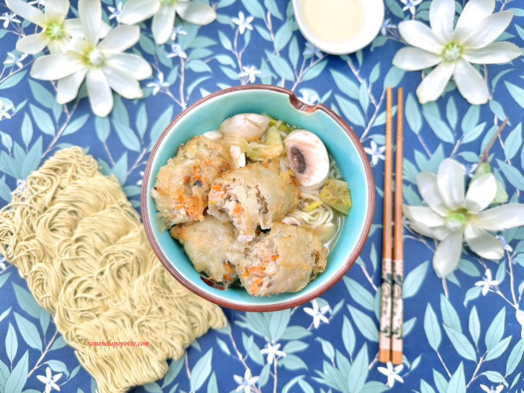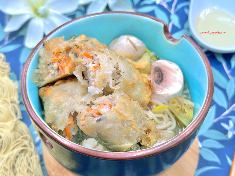 Servir dans des bols avec du bouillon, ajouter les champignons, couper les nems en deux et les déposer dessus.